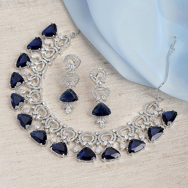 AD Necklace Set in Rhodium Plated Silver Toned Red and White American Diamond Studded Choker Necklace with Drop Earrings