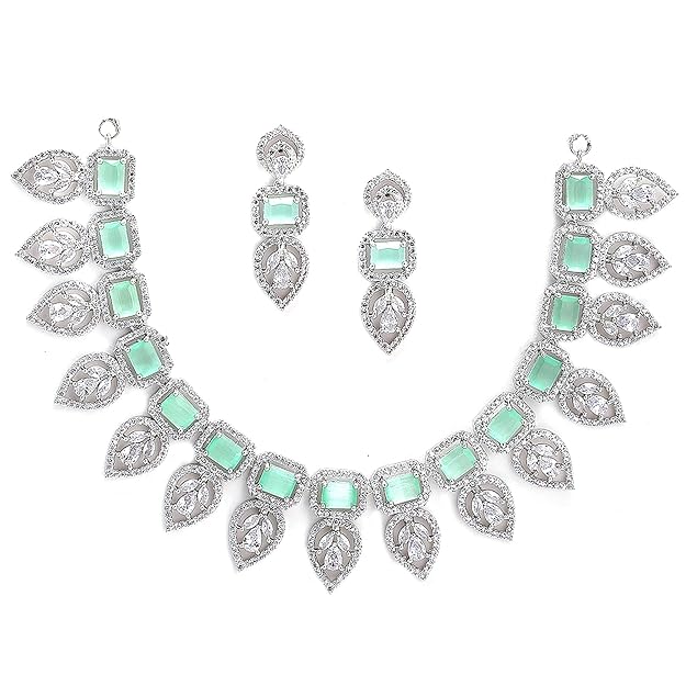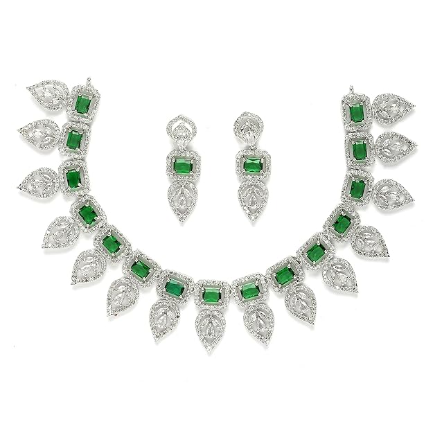 American Diamond Emerald Necklace in Leaf Style Rectangle Shaped AD Studded Rose Gold Plated Necklace Jewellery Set for Women and Girls