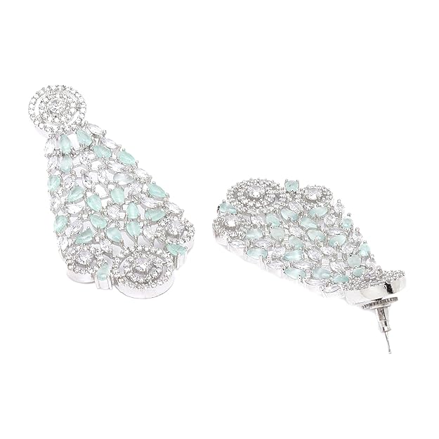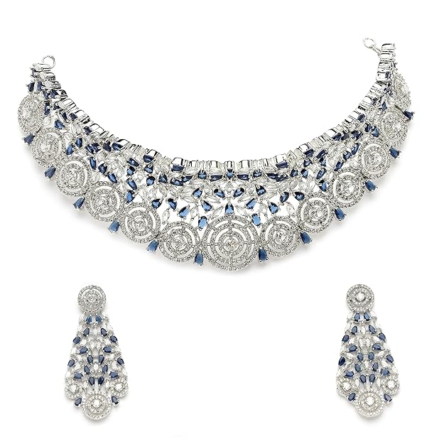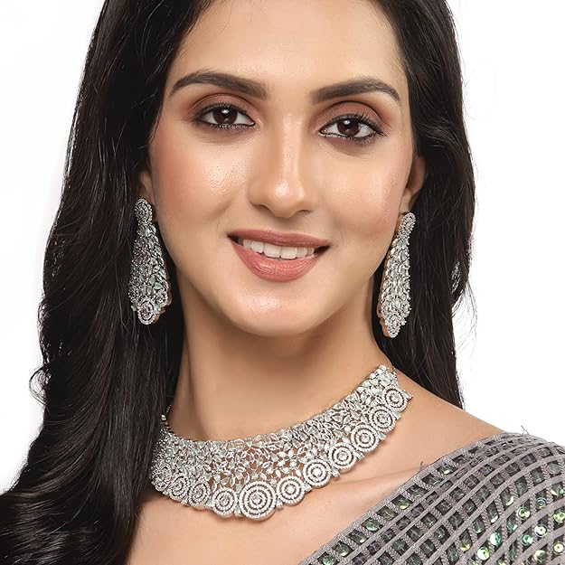 American Diamond Necklace Set in Rhodium Plated Silver Toned AD Choker Necklace with Earrings Jewellery Set for Women and Girls