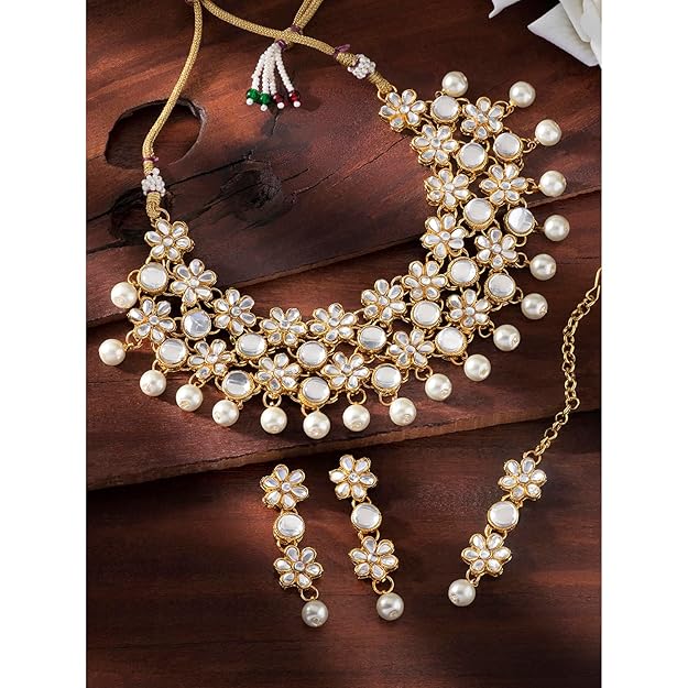 Emerald Necklace and Earring Set in Kundan and Beads Studded Necklace Earrings Maang Tikka Ethnic Jewellery Set for Women