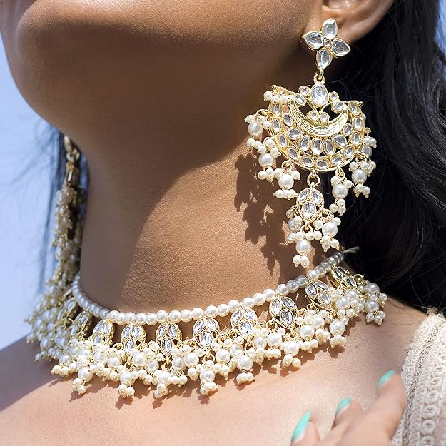 Kundan Choker Necklace in 18K Gold Plated Traditional White Pearl and Kundan Studded Choker Necklace Jewellery Set for Women and Girls