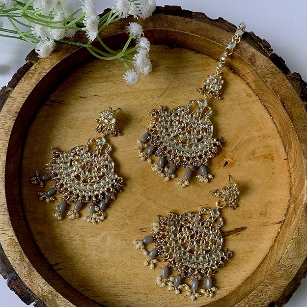 Maang Tikka with Pearl in Gold Plated Big Kundan Chandbali Earring Set