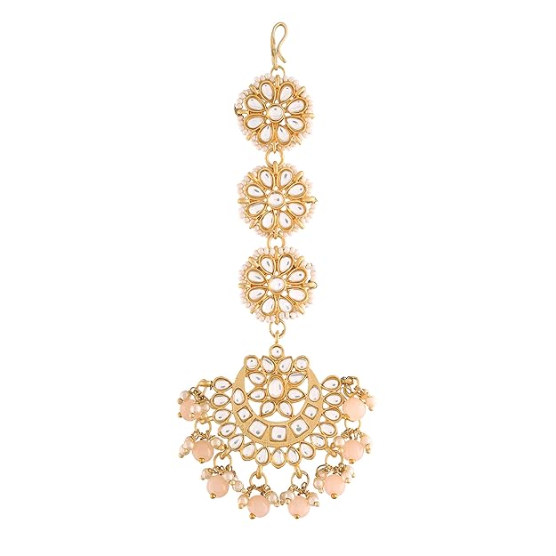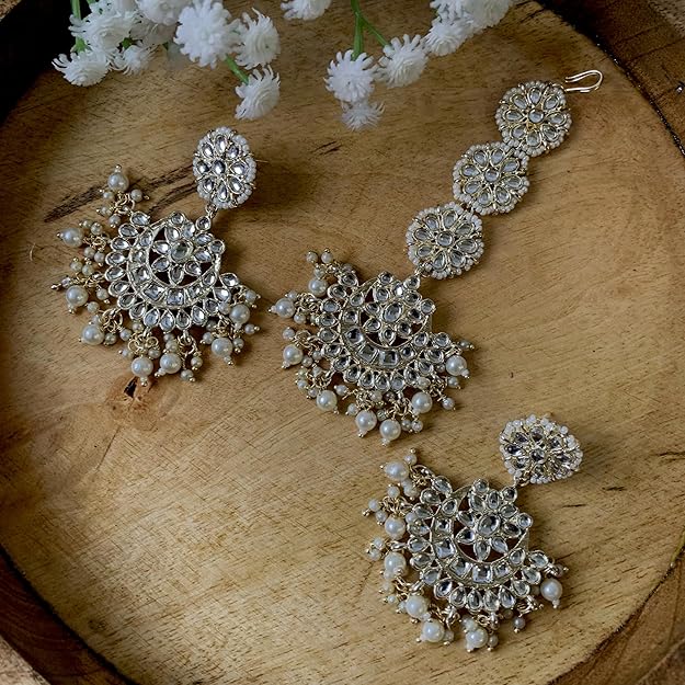 Mang Tikka for Women in 18K Gold Plated Matte Finish Kundan & Faux Pearl Chandbali Set