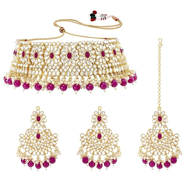 Elevate festive celebrations with this stunning Crystal and Faux Pearl Necklace and Earring Set featuring sparkling crystals, lustrous pearls, chandelier earrings, and elegant maang tikka. The gold-plated brass construction creates luxurious glamour perfect for weddings and special occasions.