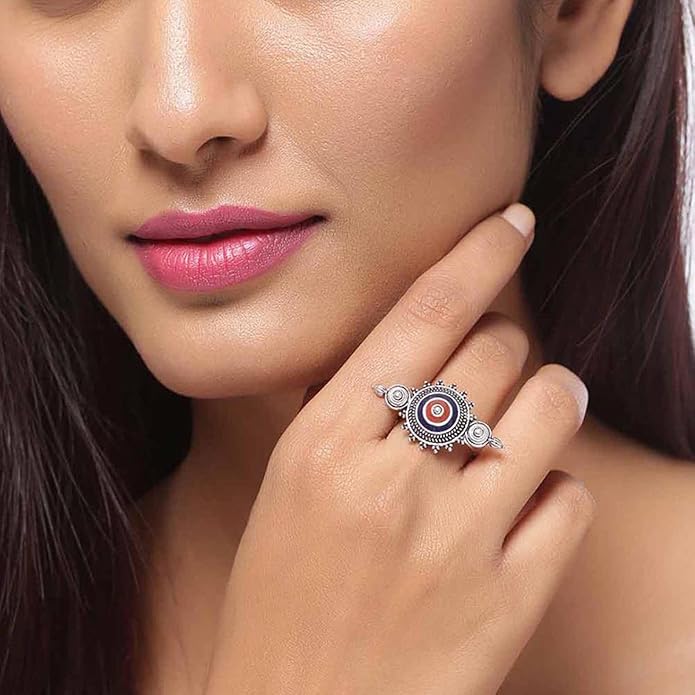 Embrace spiritual artistry with this oxidised finger ring featuring mandala Aztec inspired adjustable design for women. Crafted from brass with oxidized plating and enamel work, it symbolizes unity for engagements, weddings, or daily meaningful wear.