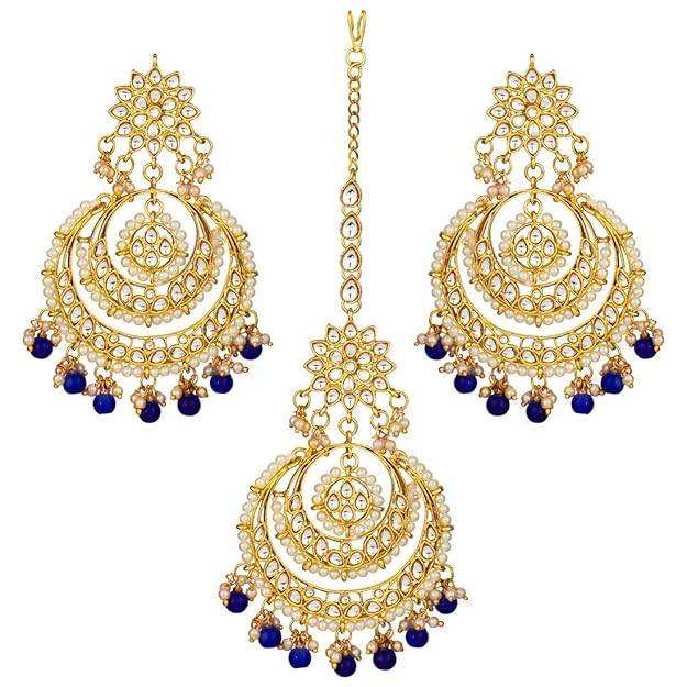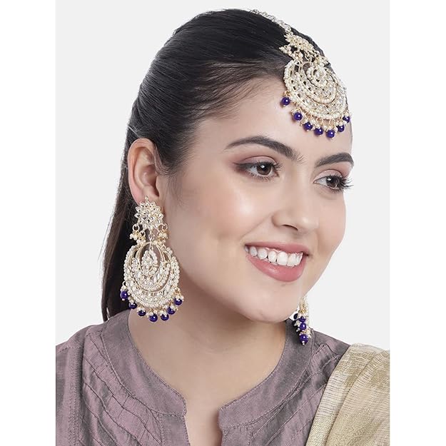 Pearl Necklace and Earring Set in Gold Plated Kundan Chandbali Design with Maang Tikka