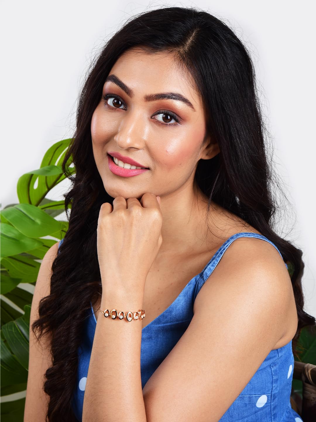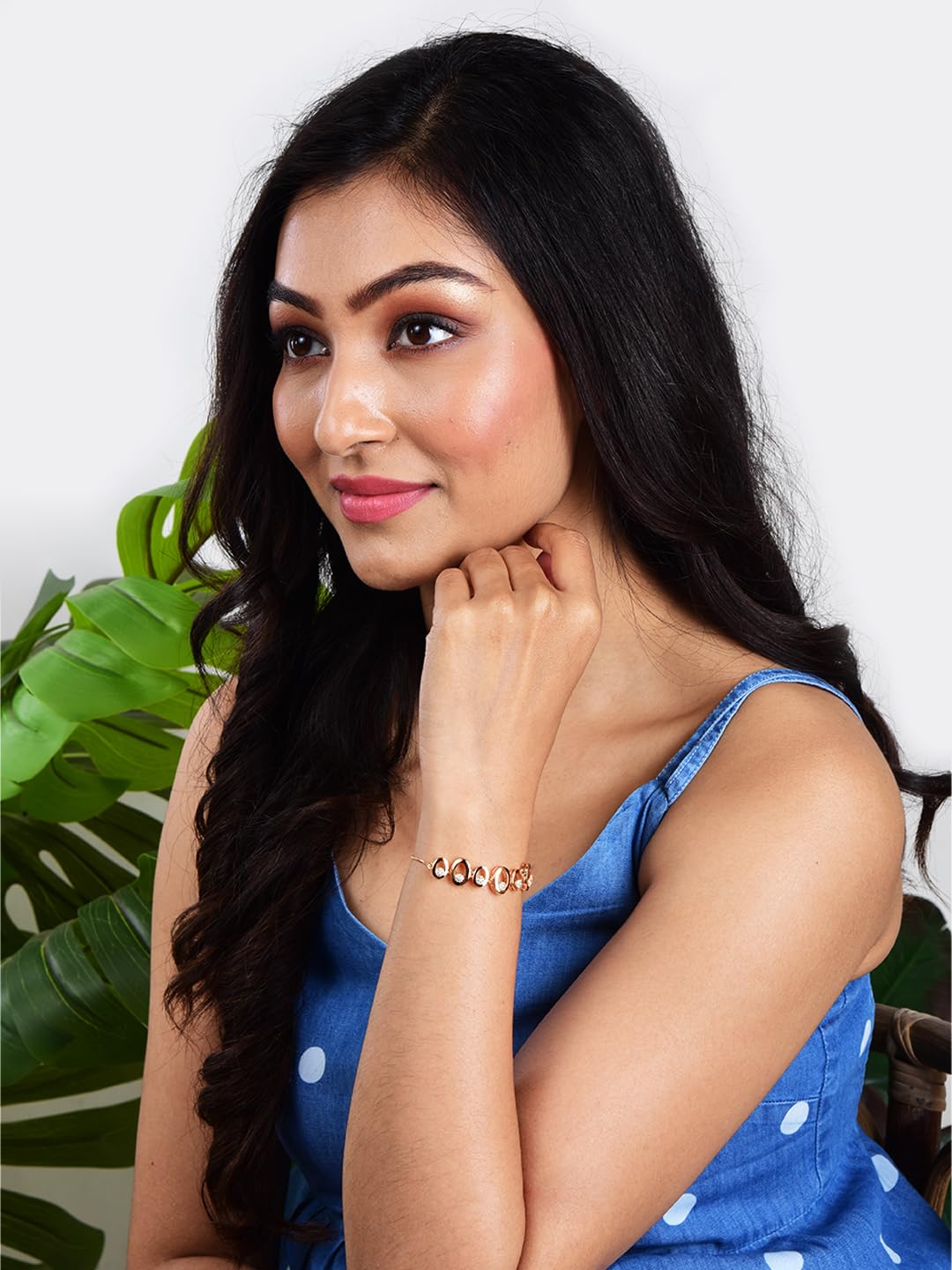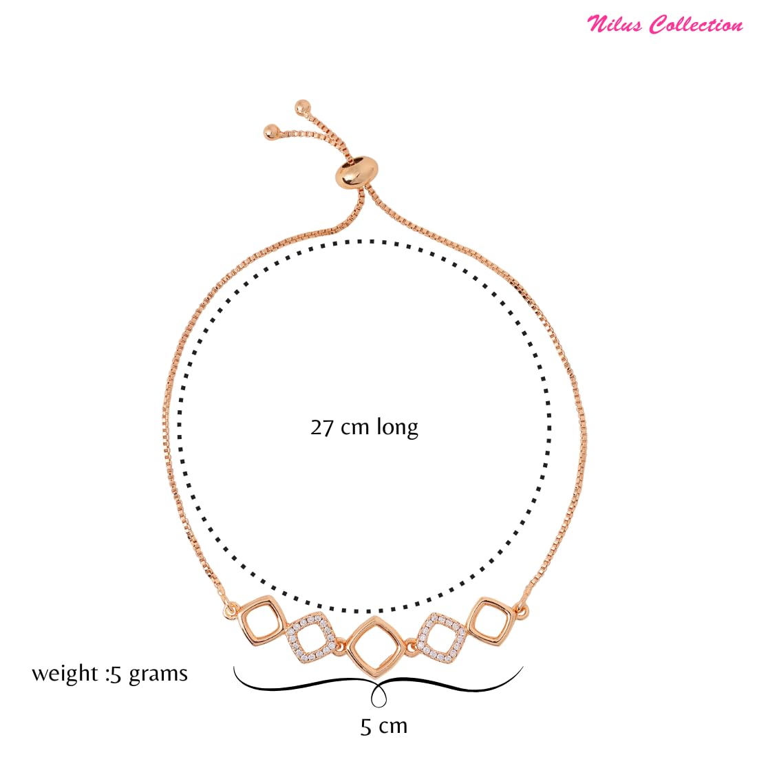 This rose gold plated bracelet is crafted from copper and features crystal detailing for a refined look. The adjustable pull chain allows a comfortable fit, making it suitable for everyday wear and special occasions.