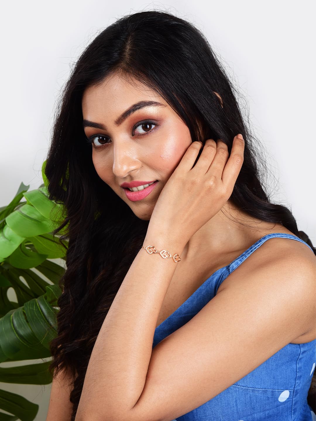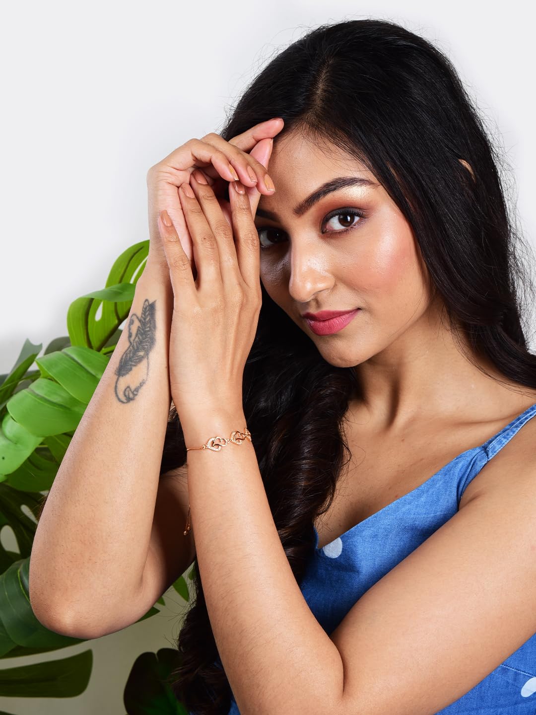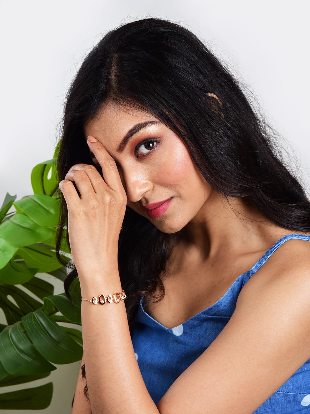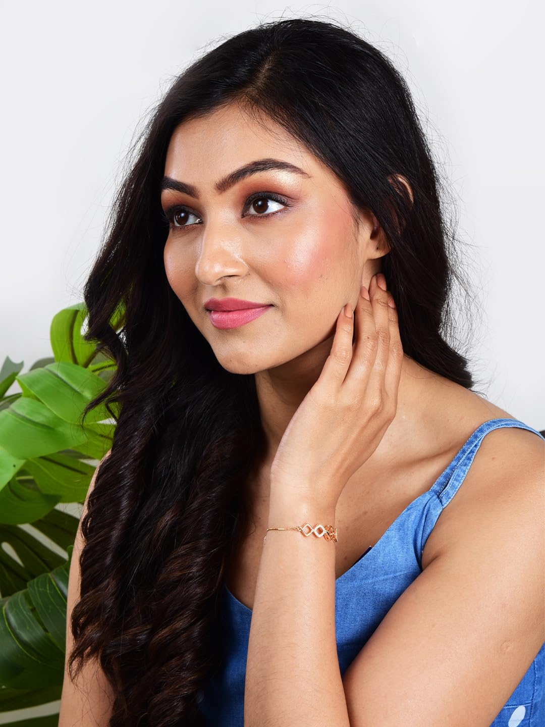 This rose gold plated bracelet is crafted from copper and features crystal detailing for a refined look. The adjustable pull chain allows a comfortable fit, making it suitable for everyday wear and special occasions.