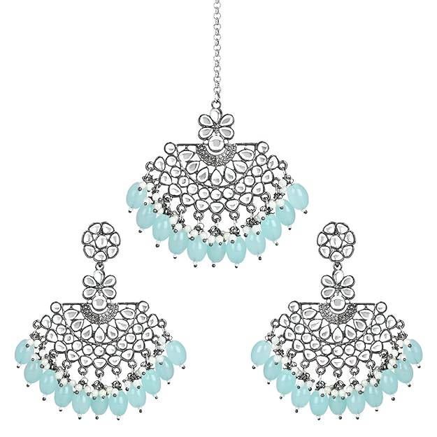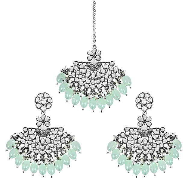 Silver Chandbali Earrings in Oxidised Kundan Pearl Design with Maang Tikka Set