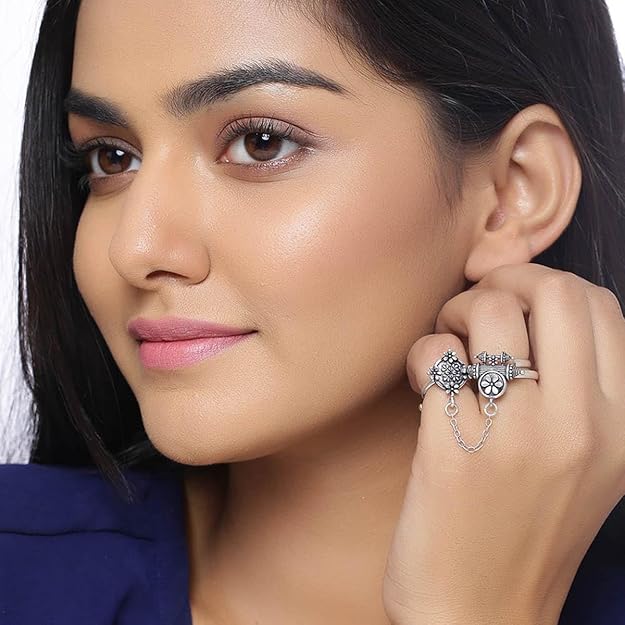 Make a bold ethnic impact with this statement rings for women featuring oxidised adjustable dual-finger design. From the Nayantara collection, its brass construction and enamel detailing blend traditional Indian heritage with contemporary flair for festive occasions.